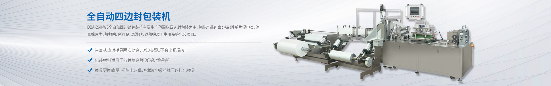 JF-260-WS全自動四邊封包裝機(jī)主要生產(chǎn)范圍以四邊封包裝為主,包裝產(chǎn)品包含:功能性單片濕巾類、消毒棉片類、熱敷貼、創(chuàng)可貼、風(fēng)濕貼、退熱貼及衛(wèi)生用品等包裝項目。關(guān)聯(lián)行業(yè):衛(wèi)生用品、醫(yī)療器械、制藥、生活用紙、美容以及無紡布制品行業(yè)。整套采用安川運動控制系統(tǒng),每分鐘速度可達(dá)80-120切,全程監(jiān)控設(shè)備運行狀態(tài)及產(chǎn)品合格率。